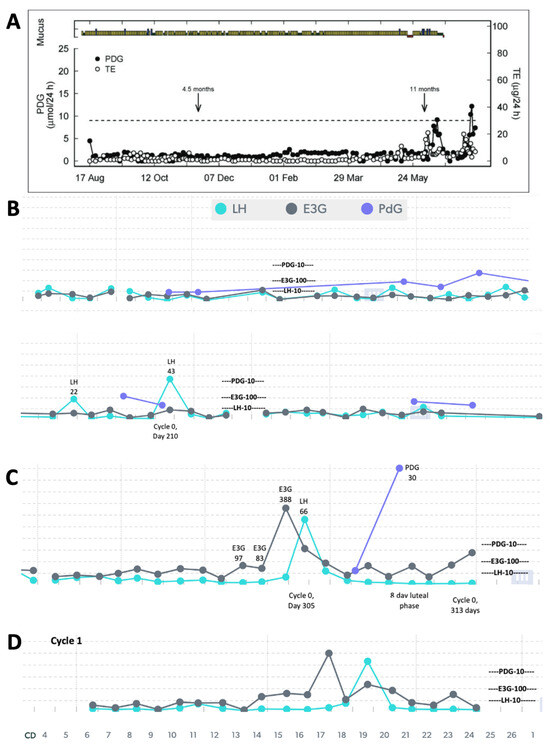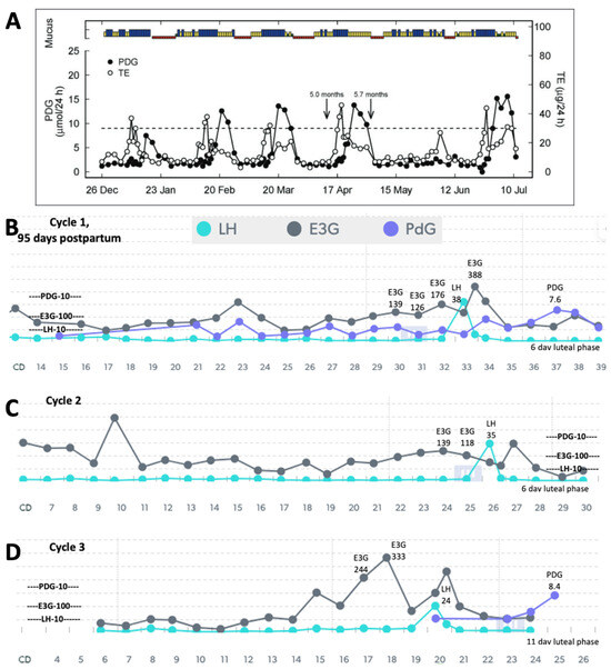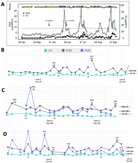 (A) Reproduction of Figure 2 from Bouchard et al. 2018 [1] showing ovarian quiescence with delayed ovulation (mucus/bleeding colours—green: dry; yellow: non-lubricative sticky mucus; blue: lubricative, clear, stretchy mucus; red: bleeding/menstruation; TE: total urinary estrogens; end of full breastfeeding with introduction of solids indicated by arrow at 4.5 months, and complete weaning indicated by arrow at 11 months). Mira Analyzer data in (B,C) show very low estrogenic activity with LH rises (marked levels) that did not lead to ovulation. In (C), a high LH surge of 66 was required to trigger ovulation, confirmed with a PDG rise (marked) and the first menses, leading to the first menstrual cycle in (D).