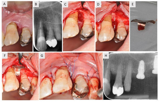 Case report of a patient who presented with an IBD between the distal root surface of tooth 23 and the mesial root surface of tooth 24. (A) Initial clinical situation. There was bone loss and associated loss of interdental soft tissue between teeth 23 and 24. (B) Initial radiographic examination. Combined vertical and horizontal bone loss was noted. (C) Flap elevation confirmed the radiographic findings. (D) After debridement, bovine xenograft was used to fill the IBD. (E) The magnesium membrane was cut in a T-shape to match the shape of the defect. (F) The defect was covered with the membrane. Note how the vertical line of the T-shaped membrane fitted into the interproximal space where the pre-existing papilla was located. (G) The flap was repositioned and sutured with single sutures. (H) Radiological examination after 6 months of healing. The radiological examination revealed satisfactory bone gain.
