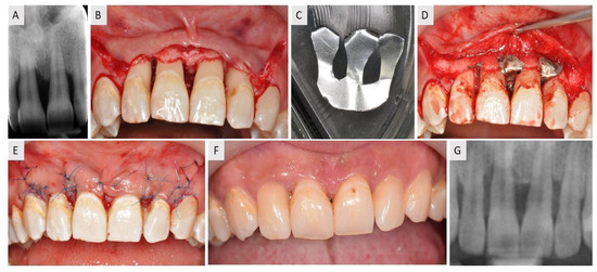 A case report of a 35-year-old female with combined vertical and horizontal defect in the esthetical zone of the maxilla. (A) The radiographic examination revealed severe bone loss. (B) Sulcular and vertical incisions were performed to elevate the flap, and the defect site was exposed. (C) The magnesium membrane was cut into an M-shape to cover interdental spaces between the teeth. (D) The defect was filled with bovine xenograft and covered with magnesium membrane that was previously shaped according to the defect. (E) The flap was repositioned and sutured using monofilament sutures. (F) Postoperative check-up after 6 months of healing. Note the healthy appearance of the soft tissues around the teeth and minimization of GBT. (G) Final radiological examination six months postoperatively revealed satisfactory bone healing.