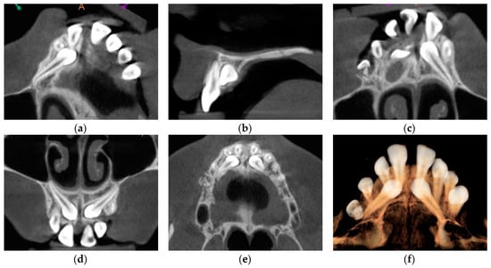 Cone beam computed tomography cross-sections with palatally impacted maxillary canines. (a) Upper right canine; (b) Proximity of the upper left canine and the upper left central incisor; (c) Upper left canine; (d) Transversal cross-section; (e) Horizontal cross-section; (f) Cone beam computed tomography rendering.
