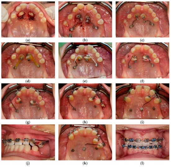 Treatment process. (a) Surgical exposure; (b) Placement of palatal alveolar mini-implants and installation of cantilevers; (c) Orthodontic extrusion with cantilevers in distal and downward direction; (d) Orthodontic extrusion with power chains; (e) Derotation of canines with power chains; (f) Extraction of upper right deciduous canine and buccal movements of impacted canines; (g) Palatal alveolar mini-implants and cantilevers for buccal tooth movements; (h) Buccal alveolar mini-implant and cantilever for buccal movement of upper left canine; (i) Mini-implant in the palatal suture used as direct anchorage for upper left canine and bend-out for upper right canine; (j) Cantilever for buccal movement of upper left canine; (k) Mini-implant in the palatal suture used as indirect anchorage; (l) Intermaxillary elastics from palatal buttons on upper lateral incisors to the lower arch.