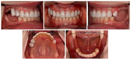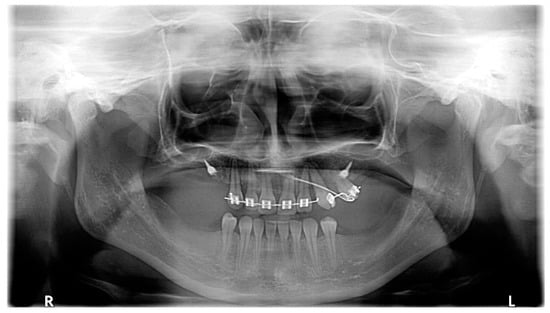 The potential complications during the treatment were the resorption of the adjacent teeth, ankylosis, loss of the attachments on the canines, and collateral effects on the adjacent teeth []. There was a high risk of the incisors’ root resorption during the orthodontic treatment. The first cause was the proximity of their roots and the canines’ crowns and the resultant potential collision during the orthodontic tooth movement []. That collision might have been caused both by the inadequate extrusion force direction delivered to the impacted teeth and by the incisors’ uncontrolled flaring. Therefore, it should have been taken into consideration when planning the orthodontic mechanics. The extrusion force was first directed distally and occlusally. After the canines fully appeared in the oral cavity, the force could be redirected buccally to slowly align them into the arch. This is also in line with a finite element study [], which reported that treatment should be initiated with vertical and distal forces. These forces yield significantly lower stress on the PDCs. Uncontrolled flaring is frequently obtained at the beginning of treatment with fixed orthodontic appliances and is characterized by the buccal movement of the crown and concomitant palatal movement of the root. The risk of root resorption was also exacerbated due to the skeletal class 3 camouflage treatment, which is associated with the potential collision of the root apices with the palatal cortical bone []. Moreover, tooth no. 13 had root dilaceration before the treatment, which has been reported as a root resorption risk factor []. In addition, dilaceration is a potential limitation in orthodontic tooth movement. The presence of the impacted teeth prolongs the treatment, which is a further risk factor []. Therefore, the canines-first approach was chosen to provide goal-oriented orthodontic mechanics, to shorten the treatment time with straight wire appliances, and finally to reduce the complication risk. According to this approach, treatment was started with the use of MIs and cantilevers instead of the initial fixed appliance placement.