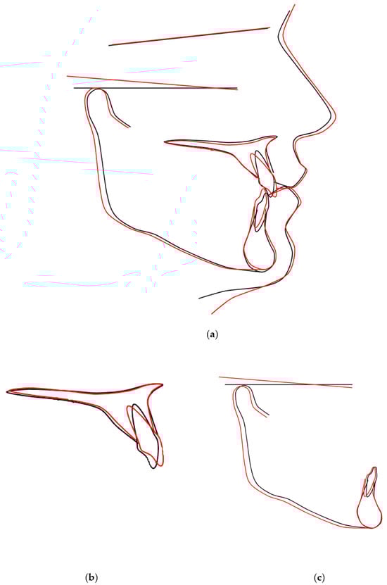 Superimposition of the initial (black color) and final (red color) cephalometric radiographs to monitor skeletal and soft tissue changes. (a) Superimposition of cranial base structures; (b) Maxillary superimposition; (c) Mandibular superimposition.