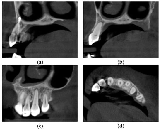 Changes in the canines’ anatomy due to conducted orthodontic treatment. (a) Upper right canine; (b) Upper left canine; (c) Bone defect of upper left canine—sagittal cross-section; (d) Bone defect of upper left canine—horizontal cross-section.