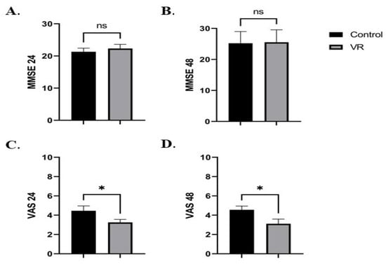 The impact of VR on MMSE (A,B) and VAS scores (C,D) at 24 and 48 h after surgery. The results are expressed as mean ±SEM. * represents a p value between 0.05 and 0.01, and ns means non-significant.