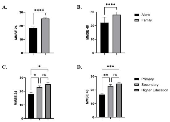 Figure 2 represents the impact of the social status (A,B) and educational level (C,D) on the MMSE score at 24 and 48 h, respectively. We observed an increase in MMSE score at 24 and 48 h, respectively, in patients living with their families compared to the patients living alone: 25.3 ± 0.5 vs. 18.4 ± 0.7 (p ˂ 0.0001) and 28.0 ± 0.4 vs. 22.2 ± 1.0 (p ˂ 0.0001) (Figure 2A,B).
