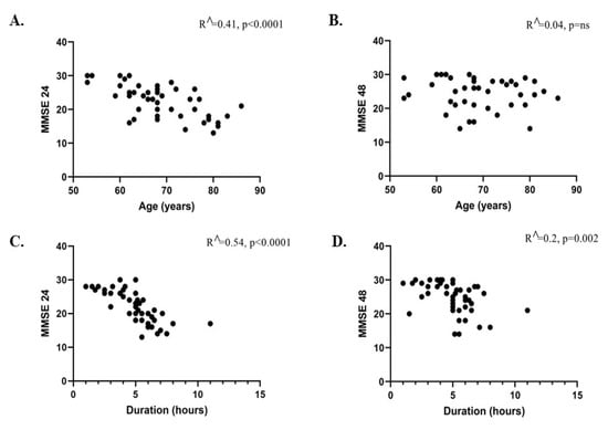 Additionally, we observed that the patients age and duration of surgery modified the MMSE score 24–48 h after surgery (Figure 3A–D). Patient age was negatively correlated with MMSE score at 24 h after surgery (R^ = 0.41, p ˂ 0.0001) but not at 48 h after surgery (R^ = 0.04, p = ns) (Figure 3A,B). Moreover, surgery duration was also negatively correlated with MMSE score at 24 h (R^ = 0.54, p ˂ 0.0001) and 48 h (R^ = 0.02, p = 0.002) after surgery (Figure 3C,D).