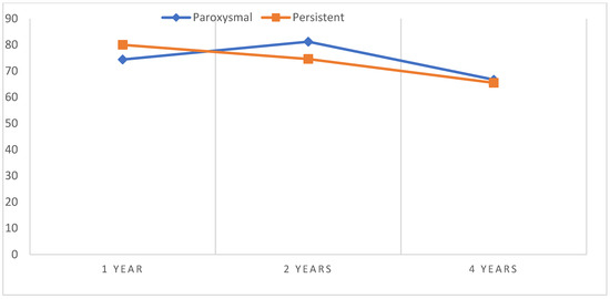 After the cryoablation procedure, freedom from AF was observed in 77.7% of patients 1 year after the procedure, in 73.4% of patients 2 years after the procedure, and in 66% of patients 4 years after the procedure. The sinus rhythm was maintained in 74.4%, 81.2%, and 66.7% of patients with paroxysmal AF and 80%, 74.6%, and 65.5% of patients with persistent AF (p = 0.693) (Figure 1). These results show that a large proportion of rhythm disturbances occurred in the first year after cryoablation, with atrial fibrillation recurrences occurring in a smaller proportion of patients in the subsequent period. There was no statistically significant difference between AF recurrence rate and atrial fibrillation type. The arrhythmia recurrence rates were similar in both the paroxysmal and persistent AF groups.