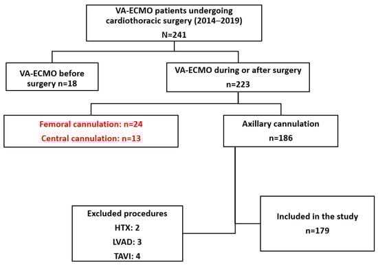 - Radakovic, D.; Hamouda, K.; Penov, K.; Bening, C.; Sayed, S.; Gietzen, C.; Leyh, R.G.; Aleksic, I. Central Versus Peripheral Arterial Cannulation for Veno-Arterial Extracorporeal Membrane Oxygenation in Post-Cardiotomy Patients. ASAIO J. 2021, 67, 67–73. [Google Scholar] [CrossRef] [PubMed]