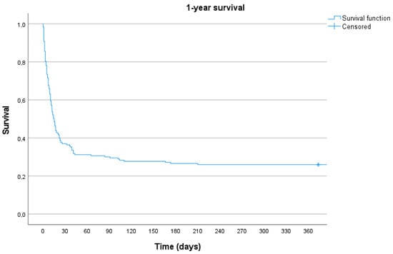 Kaplan–Meier curve depicting the 1-year survival of patients with FA VA-ECMO after PCCS.