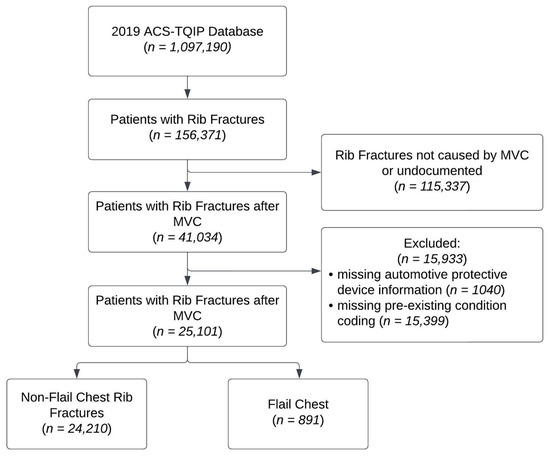 We performed a retrospective database analysis of the 2019 American College of Surgeons Trauma Quality Program (ACS-TQIP) database [15]. This is a large, deidentified database of trauma registry information from participating trauma centers. We identified all adult patients ≥ 16 years of age, without missing data, who sustained rib fractures secondary to a blunt injury mechanism, as defined using ICD-10 external cause coding (Figure 1). Study design was created using a Strengthening the Reporting of Observational Studies in Epidemiology (STROBE) checklist (Supplementary Materials—Table S1) [16]. Further grouping was performed based on external cause coding to identify patients who were involved in MVCs. Patients were further categorized by rib fracture type (single rib, multiple ribs, and flail chest) using ICD-10 diagnosis coding. A flail chest is defined as three or more consecutive rib fractures in two or more locations, creating a flail segment. Pre-existing conditions were grouped into diagnoses using Clinical Classifications Software Refined v2023.1 for ICD-10 [17]. Abbreviated Injury Scale (AIS) scoring was calculated using the ICD-PIC R package to determine maximum AIS scores per body region [18,19].