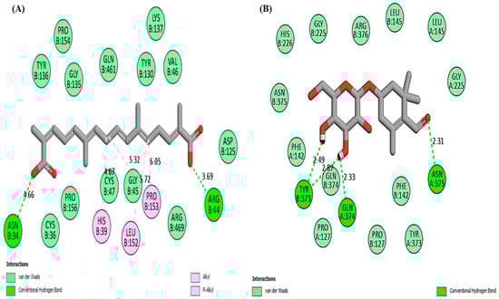 | Crocetin | Hydrogen bonding | ASN34, ARG44 |