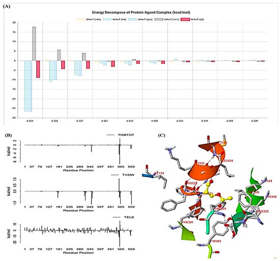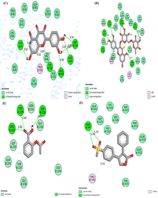 | Quercetin | Hydrogen bonding | CYS47, TYR130, ARG469, ARG44, ASP125 |
