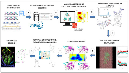 Complete workflow of the current investigation: (A) search for reported PON1 variant in literature databases, (B) retrieval of PON1 protein sequence, (C) molecular modelling and structural validation, (D) molecular dynamics simulation, (E) essential dynamics analysis, (F) retrieval of exogenous and endogenous substrates, and (G) molecular docking analysis.