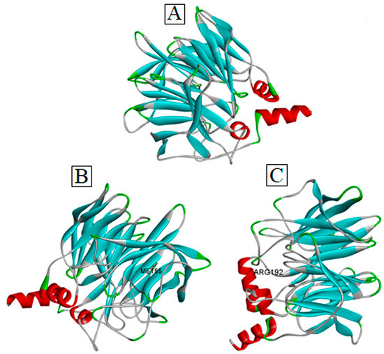 Our extensive literature database search revealed that Leu55Met and Gln192Arg are the most frequently reported missense variants of PON1 associated with a wide range of diseases [28,29,30,31,32]. In accordance with the methodology, three distinct protein sequences were generated to search for the experimental protein structure of PON1 through the BLASTp tool in the protein data bank. Due to the unavailability of the experimentally derived PON1 structure, the wild-type structure (Figure 2) was modeled using a SWISS-MODEL server with the default parameters. Overall, ~50 templates were identified for the purpose of homology modelling through the SWISS-MODEL server, among which 6H0A was selected as a template to model the wild-type PON1 protein structure. The choice of selecting PDB ID: 6H0A was deemed superior after considering criteria such as the QMEAN score (0.93), sequence identity (82.25%), oligomeric state (monomer), QMEANDisCo global scores (0.90 ± 0.05), sequence coverage (95.2%), and X-ray crystallography structure resolution (2.10 Å) in comparison to other templates. Using the selected template, the three-dimensional protein structure of PON1 was generated, and its quality was determined using QMEAN, ProSa, VERIFY-3D, PROCHECK, and ERRAT. Based on the quality assessment, the modeled PON1 wild-type protein structure showed to have -8.07 (ProSa), 0.9 (QMEAN), 86.40% (PROCHECK), 90.56% (VERIFY3D), and 93% (ERRAT). Thus, our assessment confirmed that the generated PON1wild-type structure was suitable for generating Leu55Met and Gln192Arg variant structures, respectively (Figure 2).