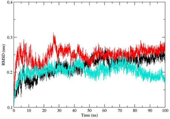 The plot of root mean square deviation (RMSD) (Backbone) values of PON1 wild-type (Black), Leu55Met (Red), and Gln192Arg (Cyan).