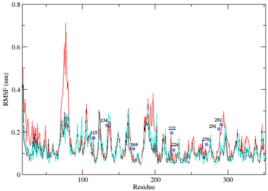 The plot illustrates the root mean square fluctuations (RMSF) of protein residues throughout a 100 ns molecular dynamics simulation for PON1 wild-type (black), as well as the Leu55Met (red) and the Gln192Arg (cyan). Blue * indicate the fluctuations at the substrate binding sites.