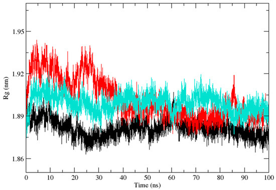 The plot of radiation of gyration (Rg) (Backbone) shows the compactness of the PON1 wild type (Black), Leu55Met (Red), and Gln192Arg (Cyan).