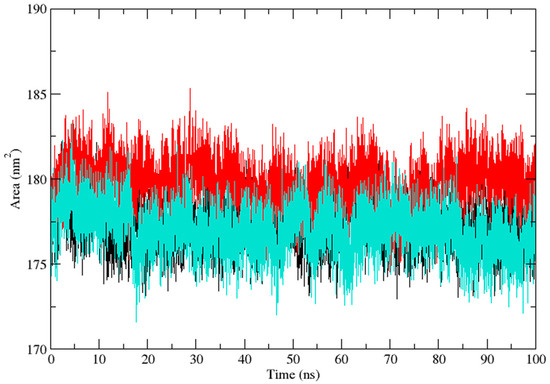 The plot of solvent accessible surface (SASA) (Protein) area demonstrates the PON1 wild type (Black), Leu55Met (Red), and Gln192Arg (Cyan) values during the 100 ns molecular dynamics simulation.