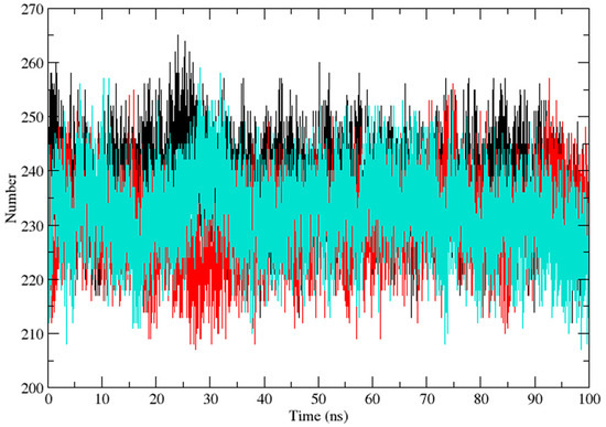The plot of hydrogen bond (HB) (Backbone) shows the intramolecular hydrogen number of PON1 wild-type (Black), Leu55Met (Red), and Gln192Arg (Cyan).