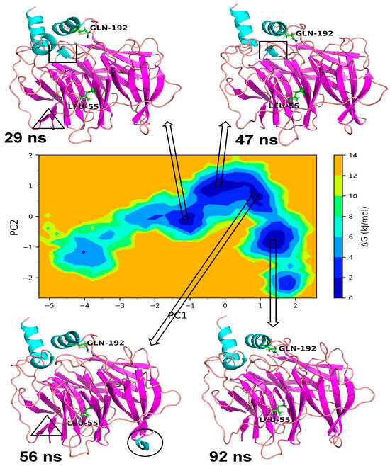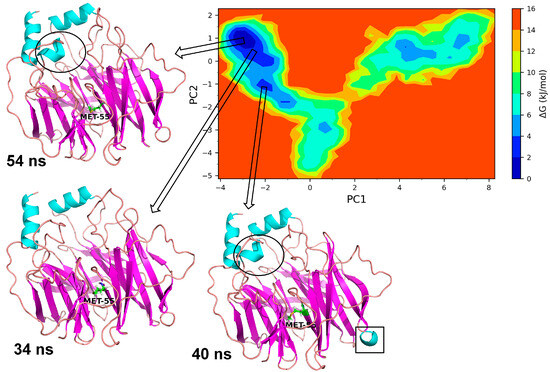 The essential dynamics were performed and two principal components (PC1 and PC2) were obtained for the MD trajectory set of each protein. These principal components were used as the reactions coordinates in the Gibb’s free energy surface (FES) analysis. The large positive values on Gibb’s FES plots represent the highly correlated conformations, while the high negative values represent the anti-correlated conformations. The energy basin with dark blue color shows the region with lowest energy meta-stable conformations, while lighter shades of the blue region show the slightly higher energy conformations with some conformational barriers. In the case of Leu55MetPON1, a small energy basin between −2.8 and −3.2 on PC1 and 0.8 and 1.2 on PC2 showed the lowest energy conformations (Figure 8). The representative lowest energy conformation from 54 ns showed three distinct α-helices. Another energy basin surrounding this lowest energy basin showed slightly higher energy conformations, where the conformational barrier was observed to be in the loop region with residues Gly288 to Asp295, where a secondary structural change to the α-helix resulted in the meta-stable conformation. A small energy basin around −2 on PC1 and around −1 on PC2 also showed three distinct α-helices along with a small α-helix in residues Gln147 to Lys151. The secondary structural changes are shown in Figure 9. Overall, the low energy conformations were fewer than the higher energy conformations for Leu55Met PON1.