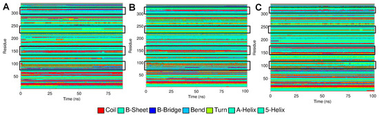 Secondary structural changes obtained from DSSP analysis. (A) Leu55Met PON1, (B) Gln192Arg PON1, and (C) wild-type PON1.