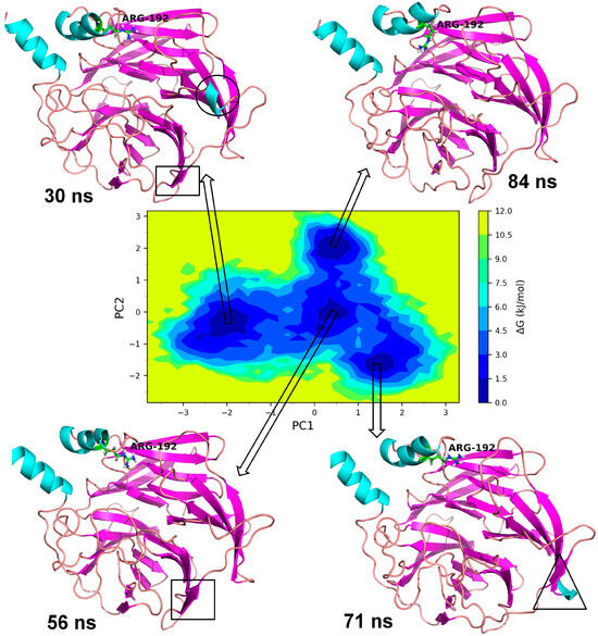 In the case of Gly192Arg PON1, there were four distinct lowest energy basins: one in anti-correlating region with high negative values on both PCs, one in the correlating region with high positive values on both PCs, one in the non-correlating region with values around zero on both PCs, and one in the anti-correlating region with high negative values on PC2. The largest numbers of conformations were found in the energy basin centered around −2 on PC1 and −0.5 on PC2 (Figure 10). The representative conformation, i.e., the trajectory at 30 ns, showed three distinct α-helices. The small α-helix that occurred from secondary structural change in the loop region residues Val109 to Ser111 was unique in this lowest energy conformation. A small β-sheet originating from the residues Cys42 to Val45 was also unique in this lowest energy conformation. Both of these unique secondary structures were not found in the lowest energy conformations in the second energy basin occupying 0 to 0.5 on PC1 and 1.5 to 2.2 on PC2. Similarly, the small α-helix made up of residues Gln147 to Lys151 was not observed in the conformations in the third-lowest energy basin centered around value zero on both PCs. However, the small β-sheet originating from the residues Val109 to Ser111 was found in the representative lowest energy conformation from this energy basin. The fourth lowest energy basin occupying 1.2 to 1.9 on PC1 and −1.2 to −1.9 on PC2 showed a unique helix region in the residues ranging from Gln147 to Lys151, while the small α-helix and a small β-sheet was absent in the representative lowest energy conformation. In the case of wild-type PON1, there were three lowest energy basins. The energy basin centered around −1 on PC1 and zero on PC2 had the small α-helix in the residues Gln147 to Lys151 in addition to the other two distinct α-helices (Figure 11). The largest energy basin showed two distinct conformations differing in the α-helices either in the residues between Cys42 and Val45 and the residues Gln147 to Lys151. The third lowest energy basin, relatively larger in size compared to the first energy basin, showed no distinct α-helices in the above-mentioned residues.