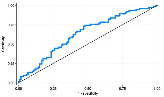 The study encompassed a retrospective analysis of 193 patients. We found the best cutoff determined by the Youden index and the ROC analysis for RFS at 640.27 with an AUC equal to 0.64 (Figure 1). There were 80 (42%) patients with a low SII and 113 (58%) patients with a high SII. The demographic and descriptive features and laboratory data are reported in Table 1.