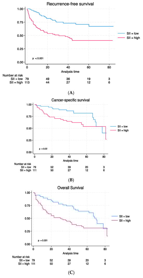 Fourth, univariable and multivariable Cox proportional hazard regression models tested the relationship between the SII group with RFS, CSS, and OS. We assessed the discriminative performance of these models using Harrel’s concordance index (C-index). To evaluate the supplementary prognostic value of preoperative SII, we compared it with reference models that did not incorporate SII. Statistical significance was determined using the likelihood-ratio test. All statistical analyses were performed using STATA/SE version 18 (StataCorp, College Station, TX, USA).