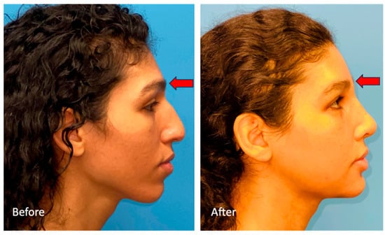 Lateral view of a patient with a type 3 frontal central brow before (left) and after (right) FFS. Before FFS, this patient displayed bossing and large projection of the anterior table. The change in profile appearance is especially notable when looking at the nasofrontal junction (red arrow). This patient also underwent mandibular angle reduction and osseous genioplasty using custom cutting guides.