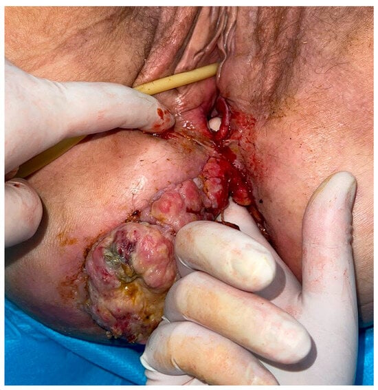 Given the patient’s critical condition and the extensive local tumor invasion, the im-mediate surgical strategy entailed abscess drainage, tumor biopsy, and the creation of a terminal colostomy to mitigate the risk of fecal contamination in the affected region (as the tumor was not causing an obstructive phenomenon). Intensive care interventions were initiated, comprising blood transfusion, fluid resuscitation, broad-spectrum antibiotic administration, and analgesic management. This acute management was intended to stabilize the patient in preparation for neo-adjuvant therapies, followed by definitive surgical intervention involving posterior pelvectomy and potential perineal reconstructive procedures.