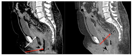 Sagittal CT of the pelvis; there is a rectal mass (white arrow) with an accompanying abscess (red arrow).