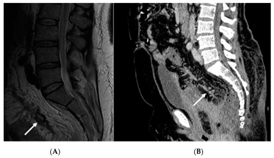 Sagittal T2 MRI (A) and sagittal CT image (B) depicting vascular invasion of the rectal tumor (white arrows).