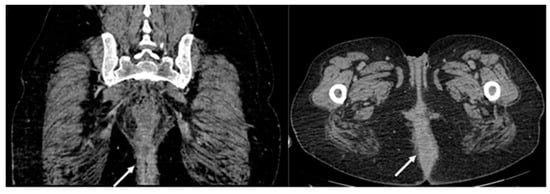 Pelvic CT depicting perineal invasion of the tumor (write arrows).