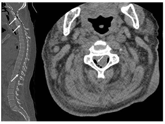 Pneumorrhachis (white arrows: extradural air bubbles are seen at the level of the cervical, thoracic, and lumbar spine.