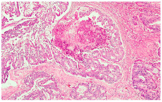Adenocarcinoma NOS with dirty necrosis. He × 200.