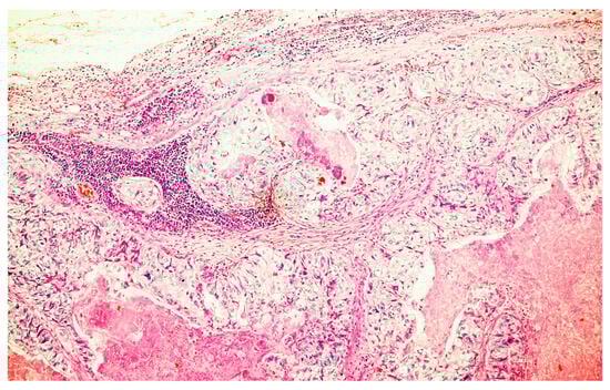 The pathology report showed rectal cancer stage IV A with T4bN2bLV2Pn1M1aR1 (Figure 6 and Figure 7).