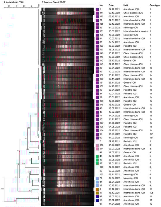 Our study started with the detection of the increase in VREfm isolates in our hospital after VREfm growth in the blood culture of the patient who was hospitalized in the anesthesia intensive care unit of Elazığ Fethi Sekin City Hospital, Turkey, with the diagnosis of respiratory failure on 2 December 2021. In accordance with the decisions of the infection control committee of our hospital, rectal swab samples were taken from all intensive care units, and VRE follow-up was performed. The samples sent to our laboratory by taking Stuart transport medium were inoculated on blood agar and enterococcosel agar chromogenic VRE medium and incubated at 35 °C for 24–48 h. Growing colonies were identified using the Vitek 2 Compact (BioMerieux, Marcy-l’Étoile, France) automated identification device using conventional methods. Suspicious colonies were identified as VRE by MALDI-TOF-MS (matrix-mediated laser desorption ionization time-of-flight mass spectrometry) (Bruker, Mannheim, Germany). Minimal inhibition concentration (MIC) values were determined for antibiotic susceptibility using both the Vitek 2 device and the E-test (AB Biodisk, Solna, Sweden) method. Antibiotic susceptibility results were evaluated in accordance with the European Committee of Antimicrobial Susceptibility Testing (EUCAST) criteria []. Samples were stored at −80 °C until the working day. Multiple swab samples continued to be collected from each patient until no new VRE was detected for three consecutive weeks. However, only one sample from each patient with the same enterococcal growth was included in the study. AP-PCR and PFGE methods were used to determine cross-contamination in VREfm isolates under investigation due to the fact that it was detected most frequently among VRE isolates. The AP-PCR method was performed as previously described by Menekse et al. []. DNA isolation was performed in the QIAsymphony SP automated nucleic acid isolation device using a QIAamp DNA mini kit. Subsequently, amplification was performed with the M13 primer (5′-GAG GGT GGC GGT TCT-3′). Amplicons were electrophoresed on a 2% agarose gel at 100 V for 1 h, then at 50 V for 470 min, and imaged using the Kodak Gel Logic 200 Imaging System (Eastman Kodak Company, Rochester, NY, USA). For the PFGE method, the protocol optimized by Turabelidze et al. [] was applied. 30 units of Sma-I enzyme were used for restriction enzyme digestion. Band profiles for both methods were analyzed using the GelCompar II software system (version 6.5; Applied Maths, Sint-Martens-Latem, Belgium). The Dice correlation coefficient was used to calculate the similarity for band analysis, and UPGMA (Unweighted Pair Group Method with Arithmetic Mean) was used for cluster analysis.