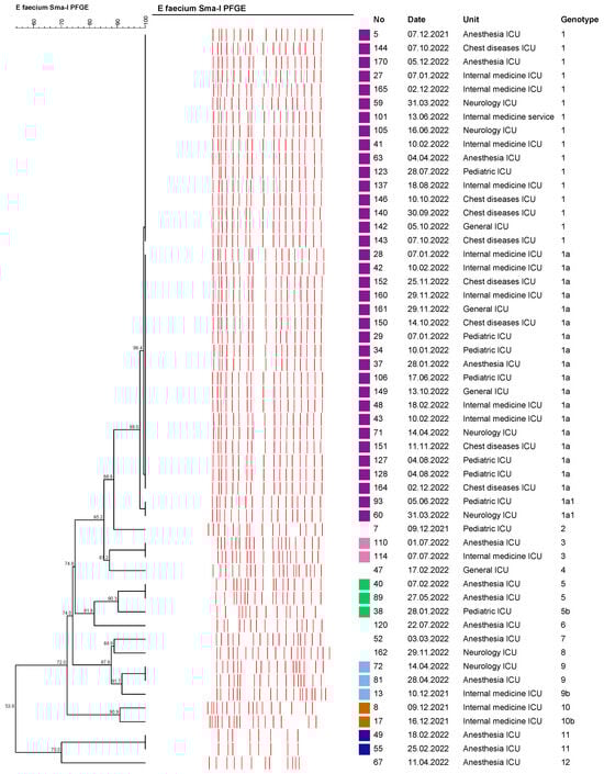 In our study, the clonal relationship of the 54 VREfm isolates, which were detected most frequently, was studied by AP-PCR and PFGE molecular methods. It was determined that all of the VREfm isolates had the vanA gene and consisted of a total of 12 different genotypes (determined by AP-PCR and PFGE molecular methods). Clustered isolates were collected in six different clusters (tolerance, 1.0; optimization, 1.0; cutoff, 90%). In total, 48 of the 54 VREfm isolates were located in any sort of cluster, and the clustering rate was determined as 88.8%. The largest cluster was determined as the genotype 1 cluster, with 36 isolates. It was determined that the isolates within the genotype 1 cluster may be associated with a possible epidemic (Figure 2 and Figure 3).