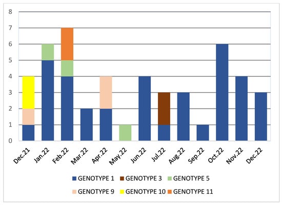 When the genotypes forming clusters by month were examined, it was determined that isolates were included in genotype 1 in all months except May, and that all VREfm isolates isolated in our hospital were included in genotype 1 starting from August (Figure 4).