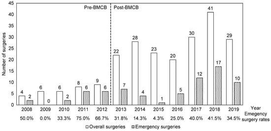 | Variable | Total (n = 226) | Pre-BMCB (n = 33) | Post-BMCB (n = 193) | p-Value |