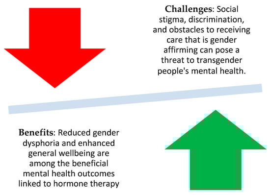 The impact of GAHT on cognitive domains remains uncertain, particularly in terms of improvements relevant to daily functioning []. While GAHT generally aligns transgender individuals’ cognitive features with their identified gender, the practical applicability of this information to the majority of trans individuals and their healthcare providers for day-to-day quality of life may be limited. Future research should shift focus away from sex-specific cognitive processes and instead explore brain regions associated with goal-directed behavior [,]. Over the past few decades, studies have indicated that transgender individuals report reduced anxiety, perceived stress, and social distress following GAHT, accompanied by improvements in mental health-related quality of life, self-esteem, and mood. Nevertheless, certain disparities regarding the effects of GAHT on anger and aggression require further investigation [].