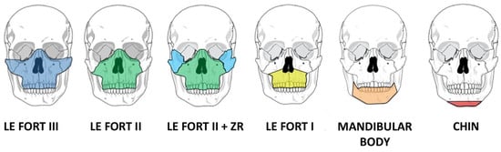 - Patel, P.K.; Novia, M.V. The surgical tools: The LeFort I, bilateral sagittal split osteotomy of the mandible, and the osseous genioplasty. Clin. Plast. Surg. 2007, 34, 447–475. [Google Scholar] [CrossRef] [PubMed]