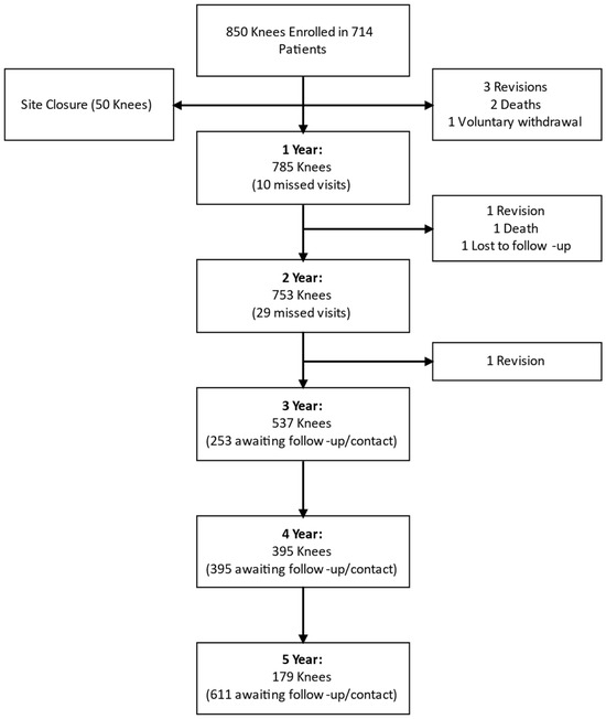 This was a prospective, multi-center, international, non-controlled outcomes study of patients who received primary TKA between November 2014 and June 2017 at 16 surgical centers in India (30.3%), Japan (12.2%), Korea (55.6%), New Zealand (0.3%), and Singapore (1.8%). To avoid a potential selection bias, participation was offered consecutively to eligible patients by each investigator. Patients who qualified for a primary TKA based upon the diagnosis of arthritis (rheumatoid, OA, traumatic, and polyarthritis), the avascular necrosis or collagen disorders of the femoral condyle, the post-traumatic loss of joint configuration, moderate deformity (varus, valgus, flexion), and/or the salvage of previously failed surgical attempts that did not include partial or full arthroplasty of the ipsilateral knee were eligible for participation. Patients with a history of infection in the affected joint or diseases that could influence bone metabolism were excluded from the study. Additional exclusion criteria included the following: participation in any other surgical intervention studies, an insufficient bone stock of the femoral or tibial surfaces, skeletal immaturity, the loss of musculature or neurovascular disease that compromises the affected limb, severe instability secondary to the absence of collateral ligament integrity, rheumatoid arthritis accompanied by an ulcer of the skin or a history of recurrent breakdown of the skin, and known or suspected sensitivity or allergy to one or more of the implant materials. One site closed in 2018 due to the departure of the primary investigator, and the 50 knees implanted at that site were excluded from the analysis, resulting in 800 cases available for review (Figure 1). Ethics approval for all sites was obtained (ClinicalTrials.gov Identifier: NCT04461626), and all subjects provided written informed consent prior to enrollment.