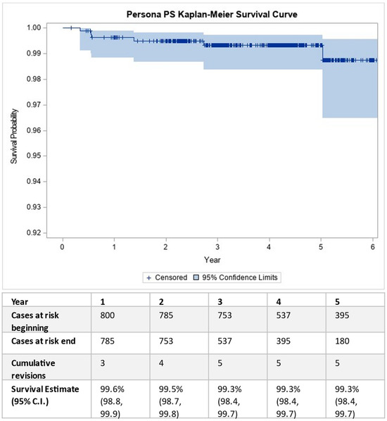 The mean follow-up period was 3.7 ± 1.3 years. The implant survivorship at the three-year follow-up was 99.3% (95% CI: 98.3, 99.7%, Figure 2). There were five failures (0.63%) that led to revision surgery (Table 2) in the five-year follow-up period. There was an additional tibial implant loosening that required revision in the sixth year assessed to be related to the device by the investigator. There were five knee-related post-operative complications that did not result in revision surgery: one superficial joint infection resolved with wound revision, two patellar periprosthetic fractures, one case of patellar clunk syndrome that was treated with arthroscopic synovectomy, and one case of subsequent trauma that resulted in an MCL avulsion that was treated conservatively.