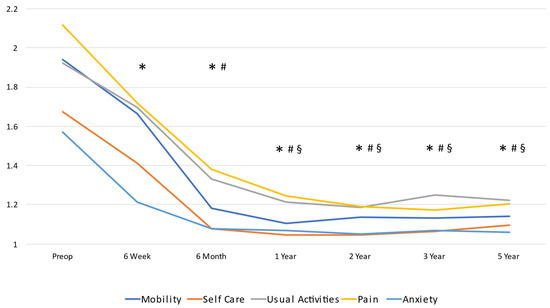 EQ5D-5L subscales. * significantly different from pre-operative assessment; # significantly different from six-week assessment; and § significantly different from six-month assessment.