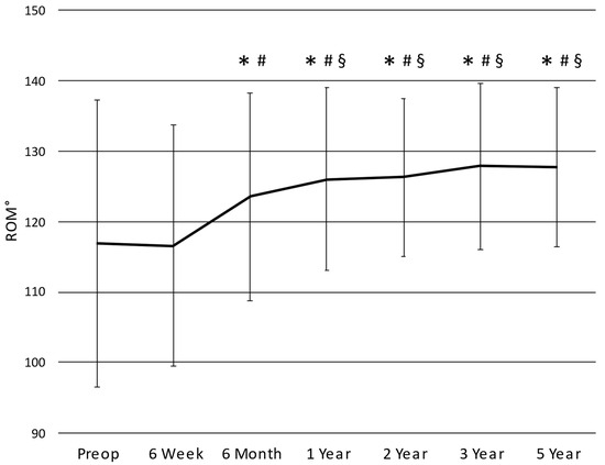 Arc of range of motion. * significantly different from pre-operative assessment; # significantly different from six-week assessment; and § significantly different from six-month assessment.