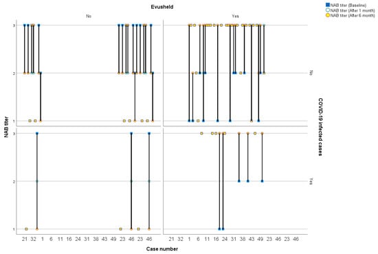 Based on the non-Gaussian distribution of the NAB titer values, the values were categorized into three categories according to the first and third quartiles (200 and 800 AU/mL, respectively). The baseline NAB scores of individuals who did not receive Evusheld were significantly higher than those who did receive Evusheld (median score 3 vs. 2). Those who received Evusheld had higher NAB scores at one and six months compared to those who did not (median scores of 3 versus 2, and 3 versus 1.5, respectively) (Table 3). A factorial ordinal regression model using Generalized Estimating Equations (GEE) with Evusheld use and time as predictors and NAB score as a dependent variable revealed that NAB score differs significantly between those with and without Evusheld use (Wald χ2 [1] = 22.538, p < 0.001). Also, time (Wald χ2 [2] = 8.982, p = 0.011) and group–time interaction (Wald χ2 [2] = 30.620, p < 0.001) affected the NAB score significantly.