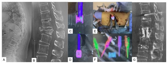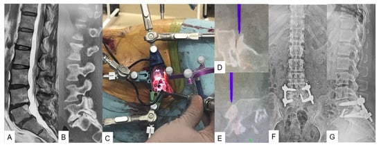 Case 4, 52-year-old female, L5 degenerative spondylolisthesis, L5/S simultaneous OLIF51 and PPS. (A) Preoperative T2 weighted MR imaging, (B) Preoperative CT, (C) Intraoperative image, (D,E) Navigation monitor, (F) Preoperative anteroposterior radiogram, (G) Postoperative lateral radiogram.