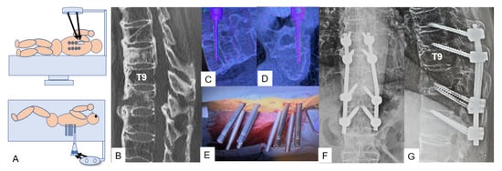 Case 2, 82-year-old male, DISH, T10 fracture, Lateral Bendini. (A) Bendini image, (B) Preoperative sagittal reconstruction CT, (C,D) Navigation monitor, (E) Intraoperative image, (F) Postoperative anteroposterior radiogram, (G) Postoperative lateral radiogram.